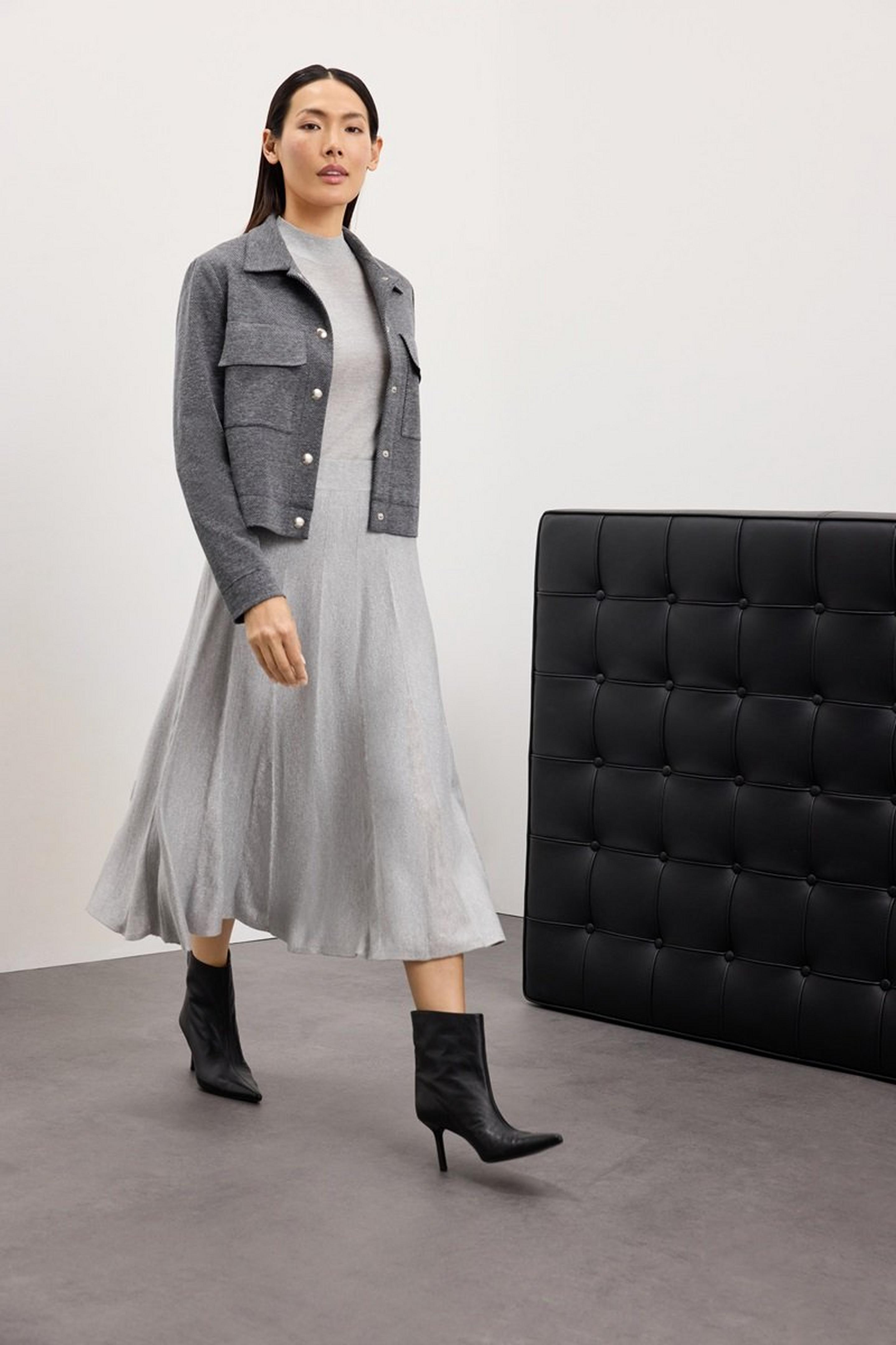 Ein Set aus softem Feinstrick ist die einfachste Antwort auf die Frage „Was ziehe ich heute an?“. Mit einer kurzen Jacke darüber wird der Look sofort bürotauglich. Funktional, feminin und perfekt für Tage, an denen du unkompliziert wirken willst – aber nicht beliebig.